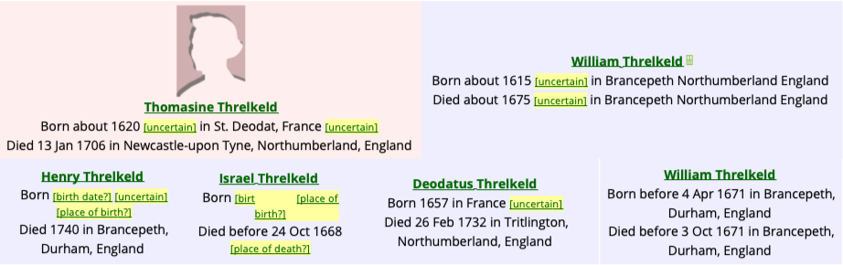 Contained within the Archaelogia Aeliana article are lineage listings for several of the children of William and Thomasine. A brother of Deodatus, Henry Threlkeld, is listed with a son, Richard Threlkeld (b 1697-1786). And Richard (nephew of Deodatus) is shown with a daughter named Isabella Threlkeld (b. 1733).